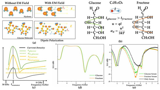 As a result, Figure 7c illustrates the average current density responding to the frequency, corresponding polarizability, and permittivity variation. In addition, we simulated and measured the 100 mg/dL glucose and fructose serum solutions and their various responses, demonstrating the specificity of the proposed sensor, as depicted in Figure 7d,e. Herein, the resonance occurring in the equilibrium condition represented the maximum electromagnetic transmission at that frequency with the slightest loss [39]. Furthermore, the amplitude of the electromagnetic oscillation attained its peak, which was reflected in the peak of S11.