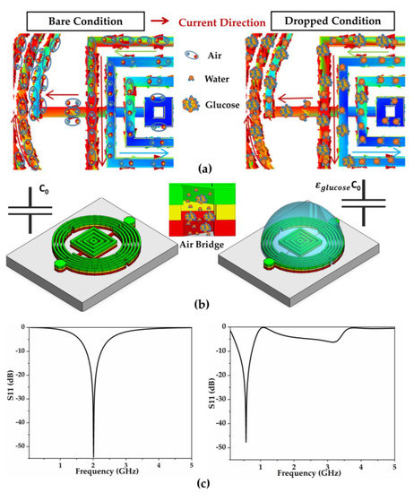 Figure 8a depicts the surface molecule distribution corresponding to surface current density, while Figure 8b,c compares the analysis and simulation of unloaded and dropped conditions equivalently. Considering the dropped analyte as the filling medium, the value of medium permittivity () at 1 increased to several dozens () based on Equation (4). Additionally, the air-bridge capacitance increased to and contributed to the overall increase in the device capacitance, which decreased the resonant frequency to the corresponding value based on Equation (1). The resonant frequency exhibited an evident decline from 2 GHz to 0.571 GHz through a simulation based on the change in filling medium permittivity from 1 to 78.