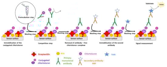 To the best of our knowledge, no immunosensor has been reported to date for the specific detection of chlortoluron, and only a colorimetric competitive ELISA was described showing a cross-reactivity for other PUs (chlorbromuron, isoproturon, and metoxuron) []. The aim of this study was to develop an immunosensor based on an indirect competitive format using a new monoclonal antibody specific to chlortoluron. As presented in Figure 2, the method was based on the competitive binding of primary monoclonal antibodies with biotinylated chlortoluron immobilized on the streptavidin-coated surface and free chlortoluron. After elimination of chlortoluron-bound primary antibodies, secondary antibodies labeled with horseradish peroxidase (HRP) were allowed to react with surface-bound primary antibodies, and the binding reaction was revealed in the presence of the HRP co-substrates H2O2 and 3,3′,5,5′-tetramethylbenzidine (TMB). The formation of oxidized TMB was detected either by colorimetric or electrochemical methods.