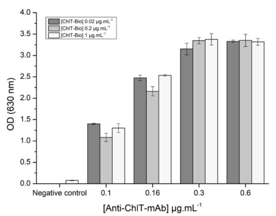 Absorbances measured using microplates coated with biotinylated chlortoluron (ChlT-Bio) at different concentrations (0.02, 0.2, 1 µg·L−1) and using increasing concentrations of monoclonal antibody (Anti-ChlT-mAb) (0.1, 0.16, 0.3, 0.6 µg·L−1).