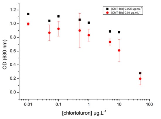 Absorbance measurements at 630 nm obtained after incubation of monoclonal antibody at 0.16 µg·L−1 with chlortoluron at concentrations ranging from 0.05 at 50 µg·L−1, and using two concentrations of biotinylated chlortoluron (ChlT-Bio) (0.005 and 0.01 µg·L−1) (assays in triplicate).