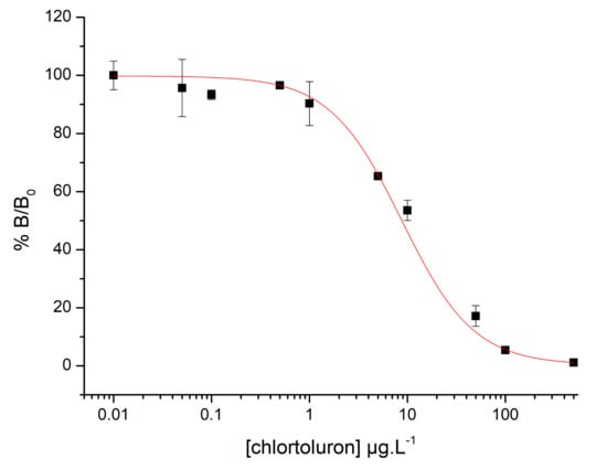 A LOD of 2.7 µg·L−1 and EC50 of 8.8 µg·L−1 were calculated as the chlortoluron concentrations leading to %B/B0 values of 80% and 50%, respectively, using the following equation: