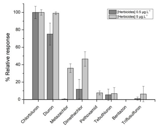 Relative response obtained in the presence of several herbicides compared to chlortoluron at concentrations of 0.5 and 5 µg·L−1.