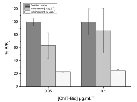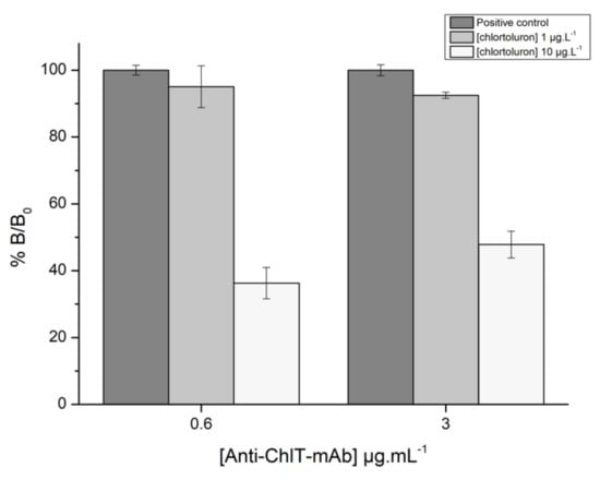 Relative response showing %B/B0 obtained in the presence of antibody (Anti-ChlT-mAb) at 0.6 and 3 µg·L−1 and in the presence of chlortoluron at 1 or 10 µg·L−1. Streptavidin and biotinylated chlortoluron concentrations were set at 5 µg·L−1.