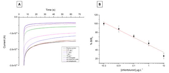 (A). Chronoamperograms recorded after incubation with chlortoluron concentrations at 0 (positive control), 0.01, 0.1, 1, and 10 µg·L−1. Applied potential −0.2 V vs. Ag/AgCl. Negative controls measured without streptavidin, conjugated chlortoluron, and primary antibody, respectively. (B). Calibration curve presenting %B/B0 versus chlortoluron concentrations (R2 = 0.96).