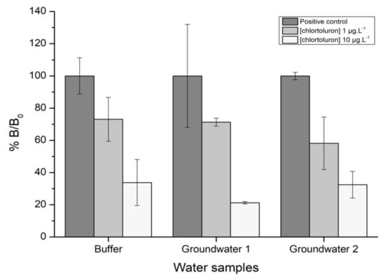 In the presence of increasing concentrations of chlortoluron, the value of %B/B0 decreased in a similar manner using either buffer or groundwaters as solvent (Figure 10), showing that no matrix effect could be attributed to the two different samples tested. The %B/B0 values obtained for 1 µg·L−1 chlortoluron were 71.3% and 58.2% for groundwaters 1 and 2, respectively, compared to 73.1% for the buffer. The result obtained for groundwater 2 spiked with 1 µg·L−1 chlortoluron could be explained by the presence of very low concentrations of chlortoluron in the original sample, in the µg·L−1 order, which could be responsible for the observed discrepancy.