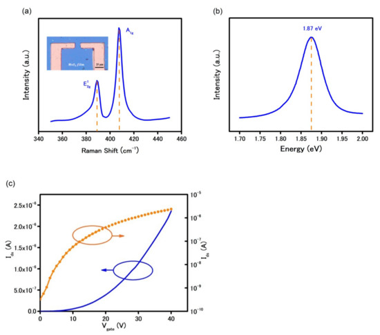 The film thickness and electrical bandgap of the synthesized MoS2 were confirmed by different techniques such as Raman spectroscopy, photoluminescence (PL) under a green laser with spot size ≈ 1 µm. The presence of two signature peaks of E2g at 385 cm−1 and A1g at 404 cm−1 in Figure 1a confirms the successful growth of MoS2. In addition, the difference in wavenumber of 19 cm−1 between the two peaks indicates the as-grown MoS2 was single-layer [16]. Due to the intrinsic direct bandgap in SL MoS2 structure, the photoluminescence spectrum in Figure 1b shows a significantly high peak at 1.87 eV.