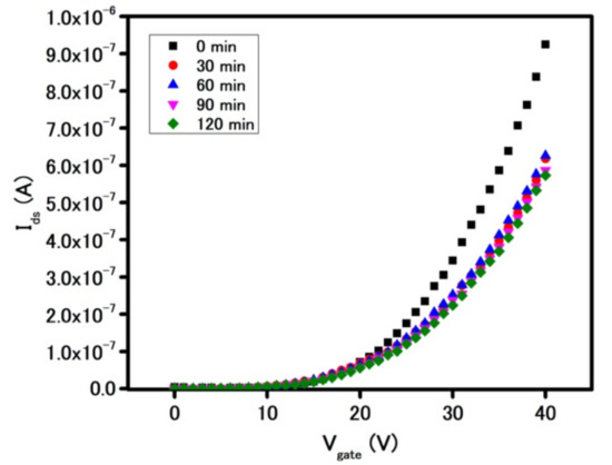 Due to the significant role of the FET measurement in MoS2-based sensors, the stability of as-fabricated FET devices becomes critical. A stability test was carried out initially in ambient air and later in both biocompatible media of phosphate buffer (PB, pH = 7.4) and DI water (pH = 7). As shown in Figure 2, the FET characteristics curve experienced a measurable decrease in current after 30 min in ambient air, which was due to the interaction between MoS2 film and oxidizing gas molecules in air [22]. However, after 30 min and for an additional 90 min under the same condition, the FET characteristics curve remained unchanged, which indicates physical and chemical pseudo-steady-state in the device.