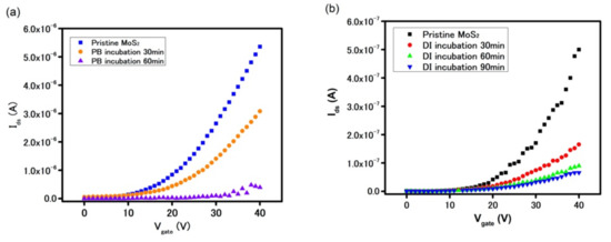 On the other hand, upon incubation in PB for 30 min by drop casting of 20 µL of PB onto the sensing area, the device showed a significant decrease in overall Ids current across the entire range of applied gate voltages as seen in Figure 3a. In fact, the current at the gate voltage of 40 V dropped by 33% after 30 min of incubation, as compared to further 1.6–5% drop after additional 90 min. Similar deterioration in electrical behavior was observed when the device was incubated in DI water (Figure 3b). Thus, in considering the similar magnitudes of diminution of Ids current for the device in the ionic PB environment and deionized water environment, this suggests the presence of water molecules as the major contributing factor for the observed electrical behavior of the device, instead of the buffer salt ions. Three possible mechanisms for how water could diminish the performance of a FET MoS2-based device were considered: