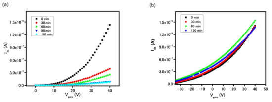 FET characteristics curves of the sensor with (a) 10 nm and (b) 30 nm Al2O3 after incubation in DI water in different time ranges.