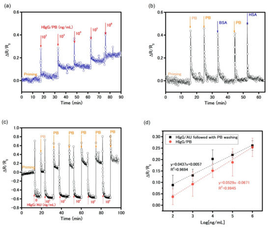 As hydroxyl groups were available on the Al2O3 layers after ammonium hydroxide treatment, anti-HIgG was covalently functionalized on the device via surface chemical reactions using APTES and glutaraldehyde to construct a biosensor to detect HIgG in PB solution. The device was initially primed with PB solution for stabilization. Then, increasing concentrations of HIgG solution were injected into the cell while the resistance of the sensor was monitored for 15 min. The result in Figure 6a shows the time-dependent change in resistance. It was evident that a spike in the readings was due to the physical injection at each injection point and yet the increase in the reading after stabilization was indeed due to increasing amounts of HIgG. It showed a stabilized signal was achieved in an average of 2 min after each addition of the target solution. It is important to note that the oxide layer, due to the strong n-doping effect, permitted electrical measurement without requiring a back-gate potential that allowed a more facile and low-power mode measurement. The biosensor exhibited good sensitivity by showing clear responses to HIgG solution of concentrations down to 100 ng/mL, as well as high selectivity with non-response to PB solutions, 105 ng/mL of BSA, and 105 ng/mL of HSA solutions, showed in Figure 6b. The calibration curve plotted in Figure 6d shows a linear relationship (y = 0.0529x − 0.0671; R2 = 0.9945) between HIgG concentration and the percentage change in resistance within a wide dynamic range from 102 to 106 ng/mL in PB solution. The sensitivity of 0.0529 per Log10 (ng/mL) was obtained from the slope of the response (∆R/R0) as a function of HIgG concentration, where R0 is the resistance of the device established with PB solution in the priming process and ∆R is a resistance change caused by affinity binding of HIgG antigen-antibody interaction. From the noise data of the PB baseline in Figure 6a, root-mean-square value of ∆R/R0 noise of ~0.034 was obtained. The limit of detection (LOD), defined as 3 × SD/m (where SD is the standard deviation of the blank and m is the slope of calibration plot), was estimated to be 83 ng/mL. Additionally, the small error bars demonstrate good reproducibility, which assures a reliable consistency in detecting HIgG.