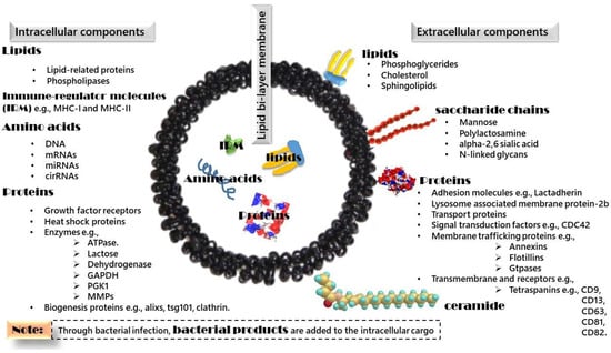 The intracellular components include (1) amino acids, e.g., DNA, messenger RNA (mRNA), microRNA (miRNA), and circular RNA (cirRNA); (2) proteins, e.g., growth factor receptors, heat shock proteins, enzymes, and biogenesis proteins; and (3) lipids, e.g., lipid-related proteins and phospholipases [32,33,34,35,36,37,38].