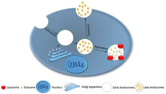 Exosome biogenesis was first discovered in 1983, when Harding, Heuser, and Stahl imaged the process in rat reticulocytes using gold transferrin temperature-dependent label methodology [43]. As transferrin uptake is a temperature-dependent process [44], their method started at 4 °C to enhance its binding with the plasma membrane, then increased the temperature to 37 °C to facilitate intracellular vesicle production. These intracellular vesicles were found to be labeled after engulfing the gold transferrin. Finally, these multivesicular bodies fused with the plasma membrane and released the gold transferrin outside the cells by exocytosis. These studies [43,44] suggested that exosome biogenesis in mammalian cells starts when cells engulf intracellular fluids and that tube-shaped early endosomes are formed and develop to have intraluminal vesicles by engulfing cytosolic components such as transmembrane and peripheral proteins; then, spherical mature endosomes are located close to the nucleus. Afterwards, these mature endosomes (also called multivesicular bodies (MVBs)) fuse with the plasma membrane to secrete exosomes into the outer membrane environment (Figure 2) [4,45]. Most mammalian cells, e.g., dendritic cells, epithelial cells, mesenchymal stem cells, and cancer cells, secrete exosomes in healthy and unhealthy conditions. In addition, body fluids, e.g., serum, saliva, urine, and breast milk, contain exosomes [46,47,48].