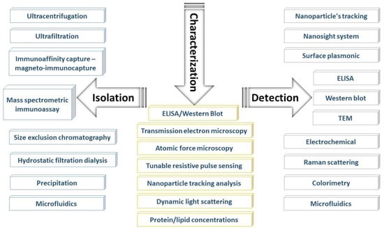 Exosome isolation and detection are a challenge because of the low concentrations and cell line-dependent heterogeneity of the exosomes [67,68,69]. Accordingly, developing and improving reliable methods to prepare, detect, and analyze exosomes is critical for exosome research and will have a great impact on the development of exosome-based disease diagnoses and therapeutics. Figure 3 summarizes the general methods for exosome isolation and detection.