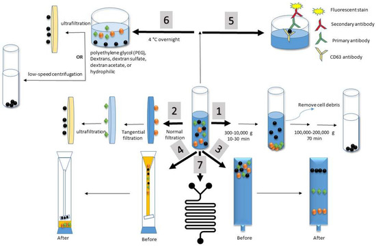 Based on the chemical properties of exosomes: (1) a water-excluding polymer, e.g., polyethylene glycol (PEG); (2) dextran derivatives, e.g., dextran sulfate and dextran acetate; and (3) hydrophilic polymers such as polyvinyl alcohol, polyvinyl acetate, and polyvinyl sulfate were used to chemically precipitate exosomes from the culture [8]. After a mixed sample was incubated at 4 °C overnight with the precipitation solution, exosomes could be isolated from the precipitate either by low-speed centrifugation or filtration, as illustrated in Figure 4 pathway no. 6. This method is easy-to-handle, does not require specific equipment, and can be scalable for large sample volumes. However, if the samples are not precleaned of cells and cellular debris, proteins and polymeric materials will be found as coprecipitates [8].