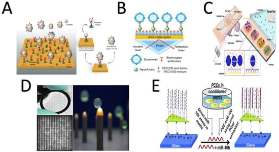 Examples of surface plasmonic biosensors for exosome detection and quantification. The figure permissions are as follows: (A) License number 5071041050010, license date 16 May 2021, licensed content publisher John Wiley and Sons. Licensed content publication of “Advanced Functional Materials”, licensed content title “Detection of Glioma-Derived Exosomes with the Biotinylated Antibody-Functionalized Titanium Nitride Plasmonic Biosensor”. (B) Adapted with permission from Liu, C. et al. 2018. Sensitive detection of exosomal proteins via a compact surface plasmon resonance biosensor for cancer diagnosis. ACS sensors, 3(8), pp. 1471–1479. Copyright (2021) American Chemical Society, Rightslink® by Copyright Clearance Center. (C) Adapted with permission from Zhu, L. et al. 2014. Label-free quantitative detection of tumor-derived exosomes through surface plasmon resonance imaging. Analytical chemistry, 86(17), pp. 8857–8864. Copyright (2021) Label-Free Quantitative Detection of Tumor-Derived Exosomes through Surface Plasmon Resonance Imaging. Analytical Chemistry (acs.org) and further permissions related to the excerpted material should be directed to ACS. (D) Adapted from Raghu, D. et al. 2018. Nanoplasmonic pillars engineered for single exosome detection. PloS ONE, 13(8), p. e0202773, with no permission required for reuse, as the work was made available under the Creative Commons CC0 public domain dedication. (E) Adapted with permission from Joshi, G.K et al. 2015. Label-free nanoplasmonic-based short noncoding RNA sensing at attomolar concentrations allows for the quantitative and highly specific assay of microRNA-10b in biological fluids and circulating exosomes. ACS nano, 9(11), pp. 11075–11089, hps://pubs.acs.org/doi/abs/10.1021/acsnano.5b04527, 10/2021, and further permissions related to the excerpted material should be directed to ACS.