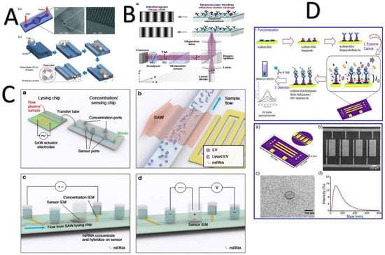 Examples of microfluidic chips for exosome detection and quantification. Figure permissions are as follows: (A) License ID 1119355-1, license date May 16, 2021, licensed content publisher the Royal Society of Chemistry. Licensed content publication of “Microfluidic fabrication of cell-derived nanovesicles as endogenous RNA carriers”. (B) Adapted from Barth, I., Conteduca, D., Reardon, C., Johnson, S., and Krauss, T.F. 2020. Common path interferometric label-free protein sensing with resonant dielectric nanostructures. Light: Science & Applications, 9(1), pp. 1–9, with no permission required for reuse as the work was made available under Creative Commons CC0 public domain dedication, 10/2021 http://creativecommons.org/licenses/by/4.0/. (C) Adapted from Ramshani, Z. et al. 2019. Extracellular vesicle microRNA quantification from plasma using an integrated microfluidic device. Communications biology, 2(1), pp.1–9, with no permission required for reuse as the work was made available under Creative Commons CC0 public domain dedication, 10/2021 http://creativecommons.org/licenses/by/4.0/. (D) Adapted with permission from Vaidyanathan, R. at al. 2014. Detecting exosomes specifically: a multiplexed device based on alternating current electrohydrodynamic induced nanoshearing. Analytical chemistry, 86(22), pp. 11125–11132. Copyright (2021) American Chemical Society. Rightslink® by Copyright Clearance Center.