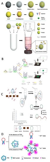 - Jin, D.; Yang, F.; Zhang, Y.L.; Liu, L.; Zhou, Y.; Wang, F.; Zhang, G.-J. ExoAPP: Exosome-Oriented, Aptamer Nanoprobe-Enabled Surface Proteins Profiling and Detection. Anal. Chem. 2018, 90, 14402–14411. [Google Scholar] [CrossRef]