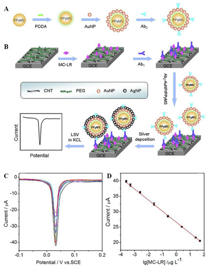 - Zhang, J.; Xiong, Z.; Chen, Z. Ultrasensitive electrochemical microcystin-LR immunosensor using gold nanoparticle functional polypyrrole microsphere catalyzed silver deposition for signal amplification. Sens. Actuators B Chem. 2017, 246, 623–630. [Google Scholar] [CrossRef] [Green Version]