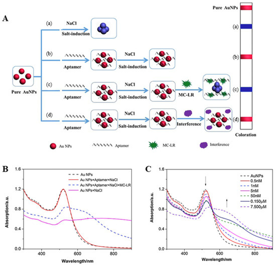 - Wang, F.; Liu, S.; Lin, M.; Chen, X.; Lin, S.; Du, X.; Li, H.; Ye, H.; Qiu, B.; Lin, Z.; et al. Colorimetric detection of microcystin-LR based on disassembly of orient-aggregated gold nanoparticle dimers. Biosens. Bioelectron. 2015, 68, 475–480. [Google Scholar] [CrossRef]