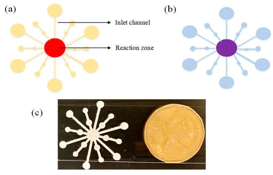 Schematic of the microfluidic paper biosensor depicting channels and reaction zones (a) color of reaction zone before the introduction of gentamicin and (b) color change from red to purple in the reaction zone after interaction. (c) The paper biosensor the size of a dollar coin.