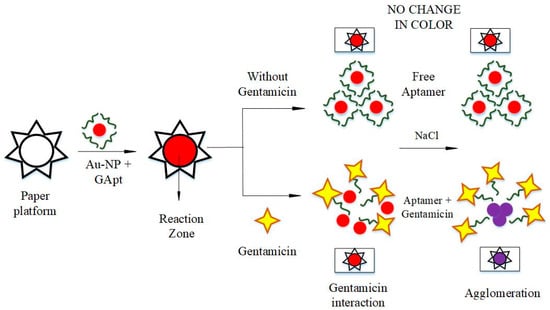 A schematic representation of the technique used for the detection of gentamicin on the paper substrate is illustrated in Figure 3. Aptamers added to the gold nanoparticle suspension remained free in the absence of gentamicin, while shielding the interfering NaCl. The overall resulting color remained deep-pink indicating no color change. On the other hand, a color change to purple was observed when the gentamicin-specific aptamer interacted with the gentamicin present in the sample.