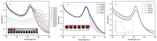 The following experiments were performed to optimize the functioning of the label-free colorimetric detection of gentamicin: (i) NaCl concentration, (ii) aptamer concentration and (iii) aptamer interaction time. As introduced earlier, sodium ions are known to disrupt the ionic stability of the prepared AuNP, resulting in agglomeration. Hence, to optimize sodium ion concentration for AuNP aggregation, 20 µL aliquots of NaCl with concentrations varying from 200–600 mM were introduced to 200 µL of prepared AuNP solution in a microplate well. Spectroscopic study of the resultant AuNP particles showed no size changes until 100 mM, while increasing concentration of NaCl (Figure 4a and inset) revealed visible color change from dark-red to purple until 280 mM. Higher concentrations (300 mM and above) demonstrated noteworthy sedimentation of AuNP, resulting in the solution to turn grey-ish. Hence, for the successful detection of gentamicin, the concentration of NaCl was carefully selected to be 280 mM.
