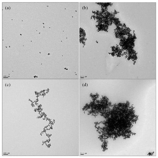 TEM images of the following: (a) untreated AuNP, (b) AuNP + 280 mM NaCl, (c) AuNP + 1 µM GA + 280 mM NaCl, (d) AuNP + 1 µM GA + 1500 nM gentamicin + 280 mM NaCl.