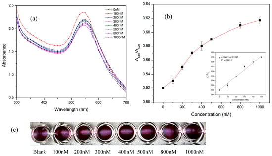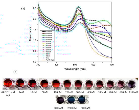Varying concentrations of gentamicin from 0–3000 nM were examined spectroscopically using a microplate (Figure 6a) and its corresponding color change is depicted in Figure 6b.