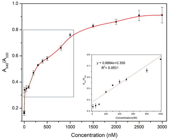 Calibration graph obtained from calculating the ratios of absorbance A640/A520 against increasing concentration of gentamicin (0–3000 nM). The inset shown the linear range of the biosensor, 10–1000 nM, with R2 = 0.95.