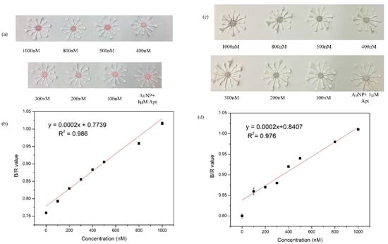 The paper sensor application is an extension to the colorimetric sensing, preformed on the 96-well plate. The paper sensor design uses a very simple fabrication technique on chromatographic paper. Of the four wider arms, two were used for the addition of reactants NaCl and gentamicin, while a solution of AuNP and gentamicin was added to the reaction zone. The shorter arms would act as absorbent pads for excess fluid applied to the larger/wider arms. Capillary action allows the sample to flow to the center of the paper flower. The quantity of reactants used on the paper substrate varied from that of the microplate experiment, but the concentration was maintained as optimized, detailed in Section 2.4. Red and blue channel intensities for both TE spiked samples and milk samples plotted as a function of B/R vs gentamicin concentration. The B/R values for TE gentamicin samples yielded a linear range from 0–1000 nM following the equation y = 0.0002x + 0.7739 (R2 = 0.986) (Figure 9a,b). The LOD was calculated to be 150 nM. Similarly, B/R values for gentamicin-spiked milk samples (Figure 9c,d) followed the linear equation y = 0.0002x + 0.8407 (R2 = 0.976) resulting in an LOD of 300 nM. The time taken for the reactants to combine by capillary effect and dry up to produce a color change was recorded to be 2 min.