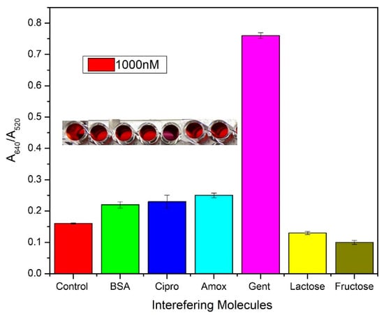 Interference studies performed with different molecules—bovine serum albumin (BSA), ciprofloxacin, amoxicillin, gentamicin, lactose and fructose by adding 200 µL AuNP + 1 µM GA + 1000 nM of interfering molecule in TE buffer (pH 7.4) + 280 mM NaCl. Inset: photograph of the well plate showing color change in the order of interfering molecules.