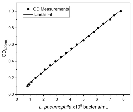 A few colonies from L. pneumophila cultures were suspended in 1× PBS and their concentration was determined by optical density (OD) measurements at 600 nm using a ThermoFisher spectrophotometer. Figure 1 shows a plot of OD as a function of the concentration of bacteria in suspension. We determined that OD = 0.1 corresponded to 6.4 × 107 of L. pneumophila/mL when suspensions were derived from fresh overnight cultures. It can be seen that a linear dependence is observed in the investigated region of concentrations. We employed a similar calibration procedure for establishing concentrations of E. coli and we determined that OD = 0.1 corresponded to 8 × 107 E. coli/mL.