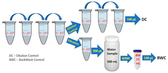 Dilutions were prepared from a freshly prepared suspension of L. pneumophila at 2 × 108 CFU/mL as illustrated in Figure 3. The actual number of bacteria per mL in a 500 mL volume of saline was determined by culture and called the dilution control (DC). The average number of bacteria captured by filtration was identified as a backwash control (BWC). The clean saline samples spiked with L. pneumophila were tested with and without acid treatment before investigating WSM functionality for filtering industrial water samples inoculated with L. pneumophila.