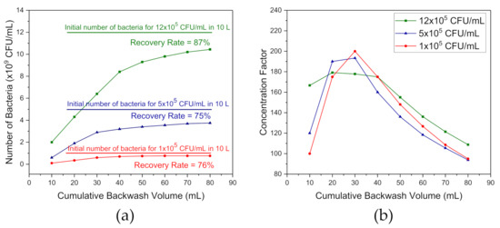 Number of recovered bacteria (a) and concentration factor (b) versus cumulative backwash volumes for 10 L of saline samples spiked with E. coli K12 at 1 × 105, 5 × 105 and 1.2 × 106 CFU/mL.