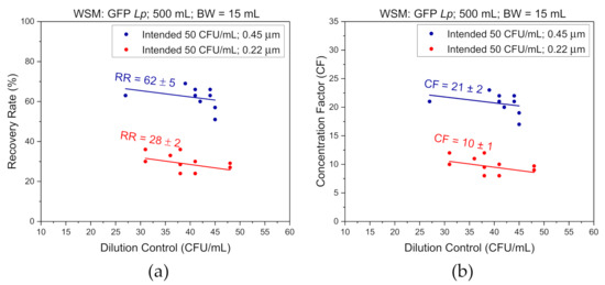 The collection of filtrates from saline spiked with L. pneumophila at ≤50 CFU/mL was obtained with one 15 mL backwash step in order to minimize the dilution of a final product. In comparison to the filtration with 0.45 µm membranes, the lower values of RR and CF obtained with 0.22 µm membranes are likely related to the reduced efficiency of eluting bacteria from a small pore size structure of membranes. These results are consistent with the results of De Giglio et al. [24] who reported recovery rates of L. pneumophila at 65% and 15% for 0.45 and 0.2 µm membranes, respectively.