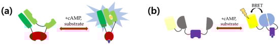 The cAMP-binding domain from PKA (RIIβB) was inserted between the N-terminal fragment and the C-terminal fragment of circularly permuted Photinus pyralis (firefly) luciferase. An initial construct, 20F, was successfully applied to monitor the cytosolic cAMP. However, it underwent saturation under certain experimental conditions in live cell imaging, and the brightness decreased in cells other than HEK293 [73,74]. A total of 11 point mutations were done: Five in the N-terminal luciferase fragment and cAMP-binding domain and six in the N-terminal linker. The new sensor 22F had a larger dynamic range (~35-fold) and a broader range (0.003~100 μM) that showed a linear response than those of 20F [75]. Figure 2a shows conformational change of 22F upon binding of cAMP and in the presence of luciferin. In live-cell imaging with HEK293 cells, this sensor was able to trace the signaling dynamics in the presence of full, partial, or inverse agonists.