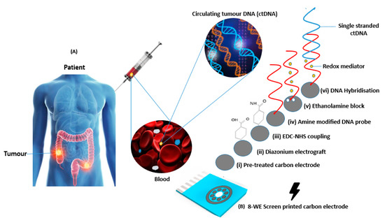 (A) Schematic showing circulating tumour DNA (ctDNA) retrieval and analysis [33,34,35] (B) Image of a screen-printed electrode array employing eight working electrodes with a common Ag reference and carbon counter electrodes along with a schematic showing modification steps and DNA functionalisation.