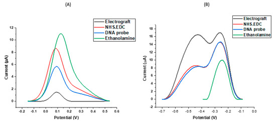 The use of an SPCE with multiple working electrodes allows each electrode to be individually modified and rapidly carry out simultaneous measurements of peak currents. Electrografting using in situ generated diazonium cations is important for modifying the surface of the SPCE by allowing the formation of covalent bonds between the carbon surface and organic films [39,40,41]. The EDC molecule is an established zero-length cross-linking agent that has been employed in coupling carboxyl groups to primary amines in various applications [41]. One of the main benefits of EDC coupling is its water solubility that allows direct bioconjugation without prior organic solvent dissolution. To improve the stability of the active ester, NHS was introduced to modify the amine-reactive chemical substance by converting it to an active NHS ester, thus maximising the efficiency of the EDC-mediated coupling reactions. The reproducibility of this hybridisation sensor was explored by simultaneously analysing all eight WEs from the multi-electrode chip after pre-treatment and electrochemical signal changes of similar amplitude, direction and magnitude were observed. Figure 2A below shows the effect of each modification step on DPV peak current using ferri-ferrocyanide. The low peak current observed after diazonium reduction can be attributed to the thickness of the film resulting from the covalent bonds created on the surface of the electrode. In Figure 2B, this effect is reversed and a higher peak current with two peaks are noted, suggesting a high sensitivity to the organic films. From the ferri-ferrocyanide characterisation, the NHS-EDC peak reflects both coupling initiation and activation on the surface of the electrode which results in an enhanced oxidation due to a neutrally charged NHS ester, leading to a negative potential shift and an increase in peak current. DNA is negatively charged and thus resulted in a decrease in peak current when immobilised on the sensor surface. There is also an electrostatic repulsion between negative ferri-ferrocyanide ions and the negative phosphate group in the DNA structure. The double peaks from the ruthenium hexaminechloride characterisation make it more difficult to identify the correct peak current. In this case, we attribute the right hand peak to the ruthenium hexamine chloride redox reaction from free solution and the smaller smeared out left hand peak to the ruthenium redox reactions taking place at higher potentials because the redox reporter is trapped in organic layers and electrostatically associating with the DNA strands on the probe modified electrode surface. The multiplexed analysis we used greatly reduced the analysis time because of the high throughput of samples and minimised reagent consumption. After introducing the probe solution to the surface of the modified electrodes, the remaining active groups on the electrode were blocked using ethanolamine to produce a consistent sensing layer in order to facilitate DNA specificity and stability in terms of the DNA binding response. Blocking the free surface on the electrode resulted in an increase in peak current in ferri-ferrocyanide characterisation. A single but decreased current peak is shown in Figure 2B after blocking and this can be attributed to the sensitivity of ruthenium hexaminechloride to the consistent layer on the outer surface of the electrode. The findings from these modification characterisations are in line with previous studies [42,43,44,45] and noting the observations on SPCEs, our optimal characterisation buffer for these studies is ferri-ferrocyanide.