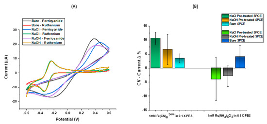 The SPCE sensor shown in this study was developed by characterising the surface of the electrode chip to determine the treatments and buffers with optimal sensitivity. In order to make the surface of the SPCE as homogenous as possible, it is important that they are pre-treated. These pre-treatments remove any binder residues left on the carbon surface after the curing process [26,27,28,29], with well-established electrochemical oxidative pre-treatments not only showing removal of binder residues left on the surface of SPCE after curing but also improvement of carbon surface sensitivity [30]. In this study, two common buffers are compared for pre-treatment: NaOH and NaCl. Up until now, few studies have been done on electrochemically pre-treating and characterising the surface of activated screen printed carbon electrodes [28,29,30]. We make the choice of a characterisation redox buffer after observing the effect of surface chemistry in relation to electron transfer rates using an inner-sphere redox mediator (Ferri-ferrocyanide) and an outer-sphere redox mediator (ruthenium hexaminechloride). Further voltammetric characterisation is performed to reveal DNA hybridisation effects and thus mutation detection in both potassium ferri-ferrocyanide (1 mM Fe(CN)63−/4− in 0.1× PBS) and ruthenium hexaminechloride (1 mM Ru(NH3)6Cl3 in 0.1× PBS) solutions.
