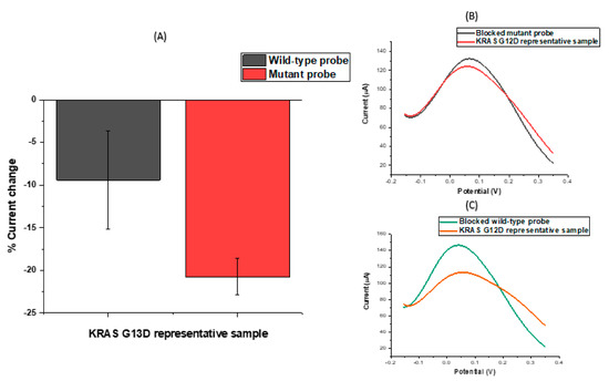 (A) CV percentage signal change in response to mutant and wild-type probes hybridized with genomic KRAS G13D ssDNA. (B,C) DPV signal changes in response to incubated KRAS G12D ssDNA hybridised with mutant and wild-type (WT) oligonucleotides, respectively.
