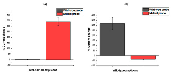 After observing consistent behaviour of modified electrodes on the same chip, the next step was to test the assay’s response to incubation in a representative KRAS sample using the designed probes. We explored the ability of the probe-modified electrodes to discriminate between G13D mutant and wild-type KRAS sequences in representative samples. To investigate specificity levels and gain an initial impression of assay sensitivity, a series of electrodes were functionalised with KRAS G13D mutant and wild-type probe sequences. The results of these experiments are summarised in Figure 4A, which shows the percentage change in the CV peak current following target hybridisation. For macroscale electrodes functionalised with biological molecules, such as DNA or antibodies, the expectation is that differential pulse voltametric peak currents will reduce upon target hybridisation. It has been observed that these effects can be reversed when micro- or nanoscale electrodes are employed [20,46], but for this study, the electrodes used were comfortably on the macro scale (diameter = 2.95 mm). For nanomolar (>10 nM) and micromolar concentrations, an increase in the peak current following hybridisation was consistently observed (and has also been observed in other data from our lab involving SPCEs) [1] for carbon electrodes which is likely explained by the high surface density of hybridised DNA amplicons changing the interfacial properties of the electrode and, therefore, altering the electrochemical response. The underlying physical mechanism of this effect is actively under investigation. Figure 4A shows that when mutant and wild-type oligonucleotide probe sequences functionalised SPCEs were incubated in a representative sample containing the G13D mutation, there was hybridisation in both cases; the signal change was greater for the wild-type probe because of the high background of wild-type DNA and the comparatively low fraction of mutated KRAS G13D present in the representative sample. Similar behaviour was observed for KRAS G12D probe functionalised electrodes for a representative sample for that particular mutation, showing the wild-type KRAS DNA hybridised strongly to the nucleic acid modified carbon surfaces. As a result of these findings and the inability to electrochemically discriminate between positive and negative samples owing to the strong influence of background DNA in the sample, DNA amplification strategies were developed and tested in order to ensure the production of unequivocal detection of ctDNA mutations.