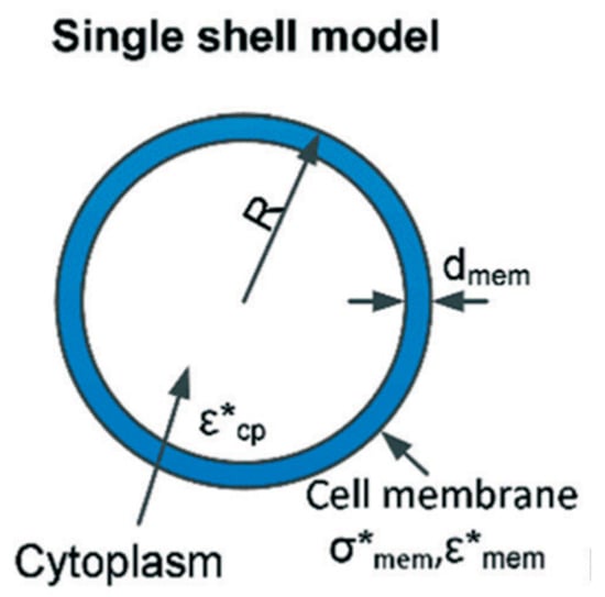 Stem cells’ cytoplasm and its contents, i.e., nucleus, DNA, organelles, etc., are considered one homogenous sphere surrounded by a plasma membrane to reduce complexity (Figure 1). For a single shell model, the complex permittivity of a cell is given by [,]: