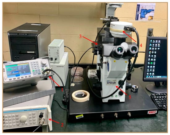 Image showing the experimental setup where the labeled parts refer to (1) function generator (up to 80 MHz) for experiments, (2) function generator (up to 1200 MHz) for experiments, (3) stage on which the dielectrophoretic (DEP) microwell is placed, (4) camera to record/visualize the experiments, and (5) Olympus IX-71 Inverted Microscope.