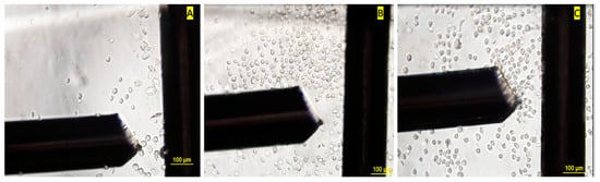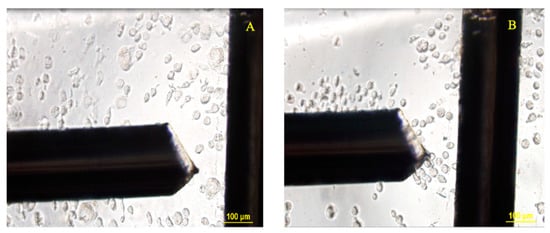 A point-and-planar electrode DEP microwell device was fabricated as previously described [,], with slight modifications to handle stem cells. Briefly, ≈30 g of Sylgard 184 silicone elastomer (Dow Corning, Midland, MI, USA) was weighed in a 50 mL glass beaker using an analytical balance (XS204, Mettler Toledo, Columbus, OH, USA) and mixed with the accompanying curing agent (≈3 g) at a 10:1 ratio. Then, the mixture was rapidly mixed with a glass rod and then degassed in a vacuum chamber to ensure that all the air incorporated in the mix due to stirring was removed, yielding an air-free, bubble-free mixture. The clear mixture was then poured into a polystyrene petri dish (100 mm × 15 mm) placed inside a dust-free, sanitized biosafety cabinet so that no dust gets into the polymer mix. Then, the polymer solution was cured at 75 °C. The cured poly(dimethylsiloxane) (PDMS) was cooled and cut into ≈6 mm × 6 mm pieces with precision, followed by a microwell, punched with a 3 mm Miltex biopsy punch, and then cut into square-shaped PDMS pieces. The PDMS piece with a punched microwell was plasma cleaned using our in-house microwave plasma cleaner [] for 2 min and sealed onto a pre-cleaned micro slide (25 mm × 75 mm, 1 mm thick) by inverting the plasma exposed PDMS surface onto the micro glass slide in less than 10 s after removal from the plasma cleaner. Then, the device is left undisturbed for ≈30 min to seal firmly and form a leak-free microwell platform. A high-grade platinum (Pt) wire (99.5%, 0.2 mm diameter) was cut into 15-mm pieces and inserted perpendicularly into the microwell. The Pt electrodes were approximately on the same plane as that of the micro slide. These Pt wires serve as the electrodes and deliver a non-uniform electric field gradient for the DEP crossover frequency experiments. A simplified figure showing the electrode setup is included in Figure 3. Spacing between the electrodes was adjusted to ≈75 µm by using an inverted microscope (Olympus IX-71). The electrode wires were sealed using epoxy to permanently fix the distance between the two electrodes, i.e., point and planar electrodes. Occasionally, the spacing was altered due to the pipette’s in and out motion from the microwell (i.e., when rinsing the microwell); when this occurred, the spacing was adjusted back to the initial spacing. The electrode distance was verified and re-measured at the beginning of every experiment.