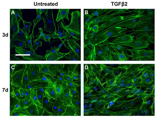 Representative images (20X) of untreated MSCs and MSCs treated with TGFβ2. The actin cytoskeleton (green) and cell nuclei (blue) are shown at 3 and 7 days. (A) Untreated cells at day 3 and (C) day 7 display typical MSC morphology. (B) Cells treated with 50 ng/mL TGFβ2 show increased elongation and proliferation at day 3, and (D) these changes become more pronounced at day 7. Scale bar = 100 μm.