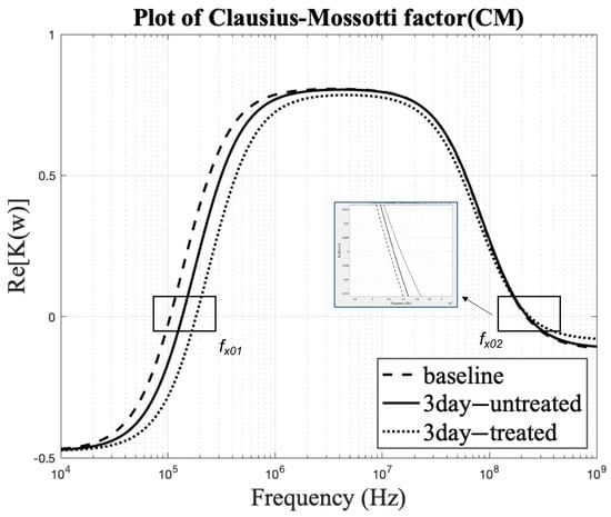 3.4. Effect on Clausius–Mossotti Factor as a Function of Frequency
