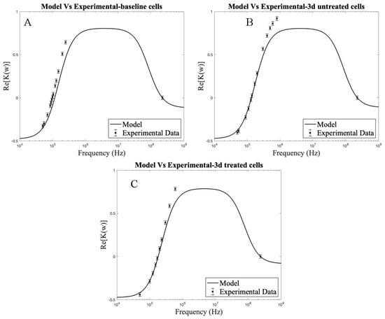 Plots comparing theoretical single shell spherical model to the experimentally determined , (A) Baseline cells, (B) 3 d untreated cells, (C) 3 d treated cells. Horizontal error bar of ±5 kHz for is included, and the respective error in Re (y-axis) is represented.