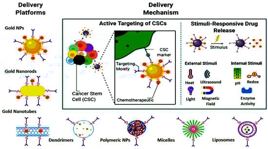 Additionally, another study by Feng et al. strongly suggests an effective OSA-targeting liposome system functionalized with a dual-targeting polymer redox-cleavable, bone- and cluster of differentiation 44 (CD44). Here, the effect of a tumor-penetrating peptide, internalizing RGD, was clearly shown by Feng and his colleagues []. In this case, alendronate (ALN), a bone-targeting moiety, was first conjugated with HA, a ligand for CD44. Via a bioreducible disulfide linker (-SS-), this ALN-HA conjugate was coupled with DSPE-PEG2000-COOH to obtain a functionalized lipid, ALN-HA-SS-L, to be post-inserted into constructed liposomes loaded with DOX. In addition to strong and fast cellular uptake, ALN-HA-SS-L-L/DOX had considerably higher cytotoxicity for human OSA MG-63 cells compared to different reference liposomes. ALN-HA-SS-L-L/DOX displayed impressive tumor growth suppression and extended survival time in the orthotopic OSA nude mouse models. This finding indicates that a successful OSA-targeted therapy can be ALN-HA-SS-L-L/DOX, designed with bone- and CD44-dual-targeting skills and redox sensitivity. Co-administration of internalizing RGD might also improve effectiveness. In another research, a cationic liposomal estrogen linked system was developed for the targeted delivery to OSA. Chotooligosaccharides were covalently attached to liposomes through disulfate linkage and estrogen was anchored via PEG for estrogen receptor targeting. In addition, doxorubicin was embedded in the liposomes for the treatment of OSA. The liposomes released the drug in response to tumoral intracellular glutathione. The tumor targeting was investigated by studying the uptake in MG-63 OSA cells. Furthermore, the chotooligosaccharides grafted estrogen functionalized cationic liposomes exhibited intracellular drug delivery to the estrogen receptor expressed on the OSA cells []. Other similar chotooligosaccharides surface coated redox sensitive fusogenic liposomes were studied for OSA. Doxorubicin was loaded in the liposomes for anti-tumor activity. These liposomes were found to be stable with low drug leakage and higher cytotoxic level in the cancer cells. The redox sensitive liposomes had higher cytotoxicity to MG-63 OSA cells than the normal liposomes and had lower cytotoxicity for the LO2 liver cells. Altogether, the liposomes extended survival rate in animals []. Some of the nanocarriers based on stimuli responsive drug release are shown in Figure 4. The figure also explains the unique concept of cancer stem cells (CSCs) targeted therapy.