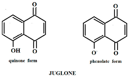 It is known that naphthoquinones are slightly soluble in water. A small amount of juglone (a quinone form) dissolves in water [3]. When juglone is subjected to aqueous NaOH solution, hydrogen is replaced by metal in the hydroxyl group in the aromatic ring (a phenolate form). A phenolate form of juglone becomes water-soluble. The structural formulas of the quinone and phenolate forms of juglone are shown in Figure 1.